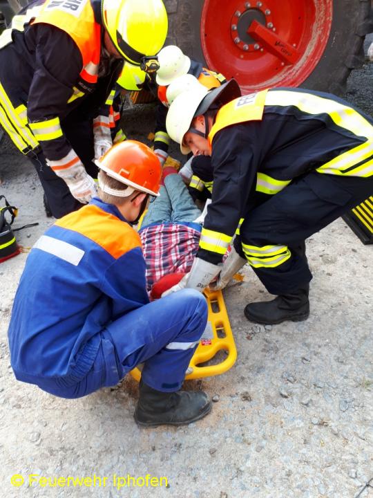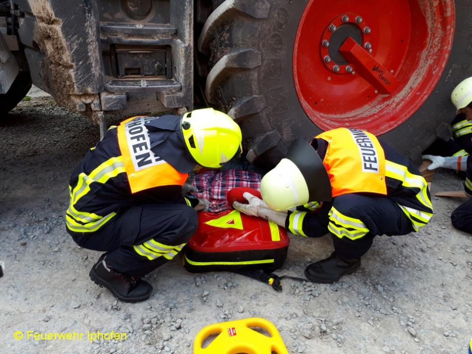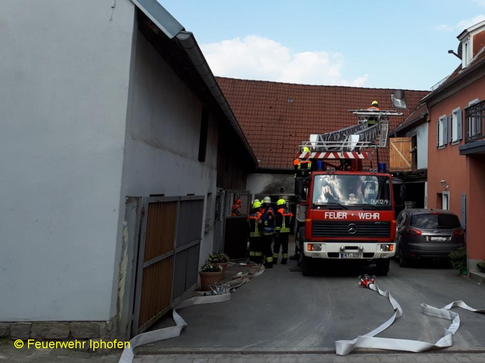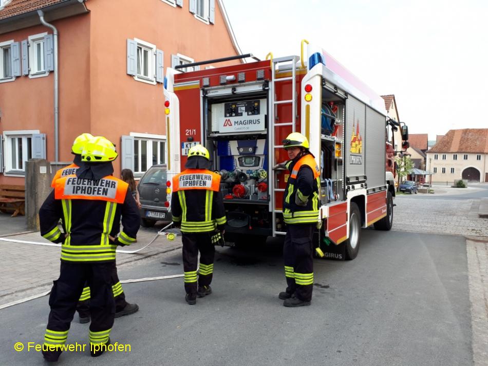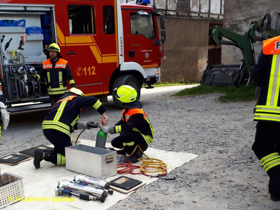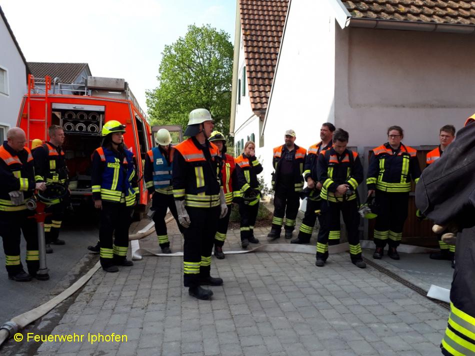 Übungsbericht: Brand eines landwirtschaftlichen Anwesens im Ortskern, dieses durchaus realistische Szenario hatte sich die FF Possenheim für unsere gemeinsame Übung ausgedacht. Zwei Personen sollten aus dem Heuboden über Drehleiter gerettet werden. Die FF Possenheim hatte bereits mit den "Löscharbeiten" begonnen, von Seiten der Iphöfer wurden die Possenheimer unterstützt und eine Riegelstellung an der Rückseite des Stalles aufgebaut. Da auch noch ein Schlepper eine Person "überfahren" hatte, musste diese mit den Geräten aus unserem HLF und einer gemischten Mannschaft aus Iphofen und Possenheim befreit werden.