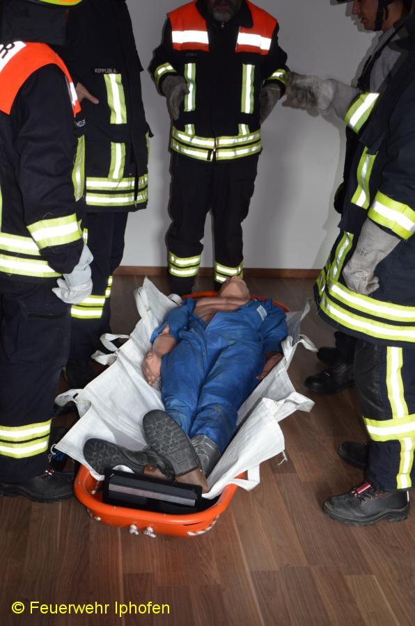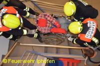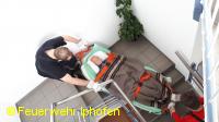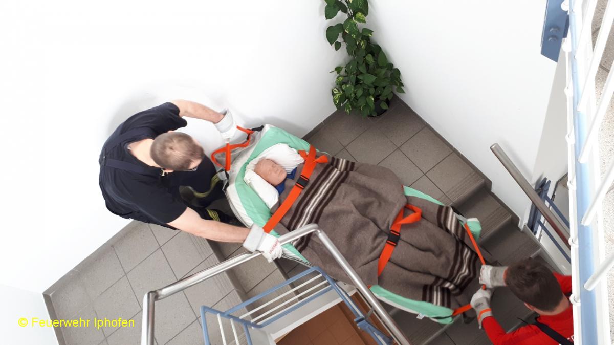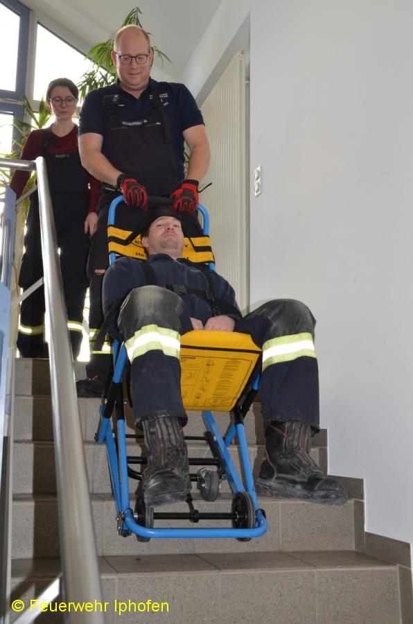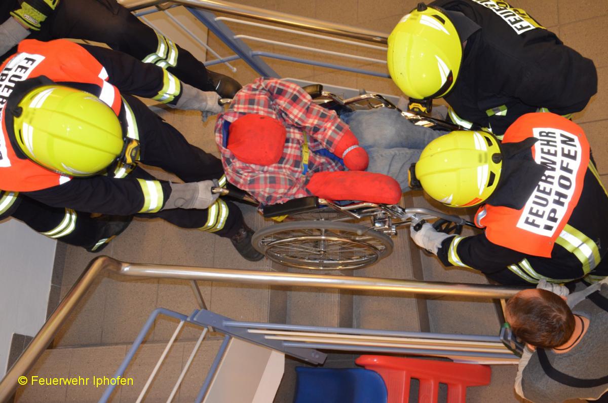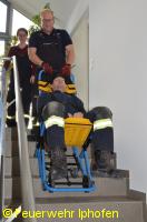 Wie rettet man eine bettlägerige Person aus dem Seniorenheim? Und wie bringt man einen Rollstuhfahrer am schnellsten ins Freie? Was ist ein Evakuierungsstuhl und wie bedient man ihn? Das waren nur einige der Aufgaben, die in Kleingruppen bewältigt werden mussten. Daneben stand noch der Klassiker, die Personenrettung über die Drehleiter, auf dem Programm. Richtig schweißtreibend war dann die "Tragehilfe Rettungsdienst", bei der ein Dummy als Herzinfarktpatient vorsichtig durch ein enges Treppenhaus transportiert werden musste.